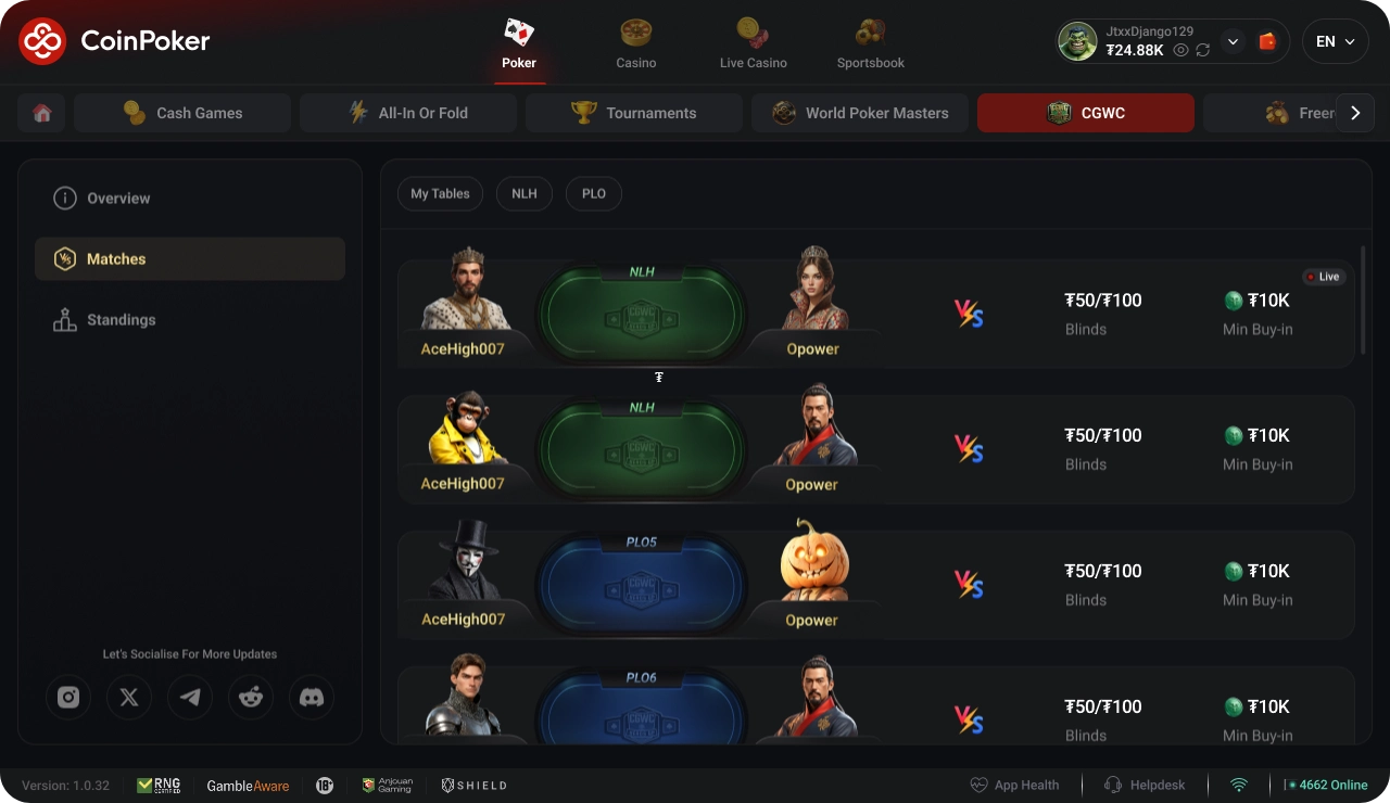 如果您没有在 CoinPoker 桌面应用程序上观战,请观看 CGWC 单挑赛的现场直播,或与我们的社群一起关注比赛动态。