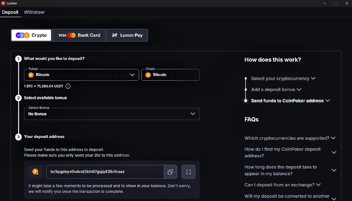 6. Senden Sie Ihre Einzahlung an die Wallet-Adresse von CoinPoker: