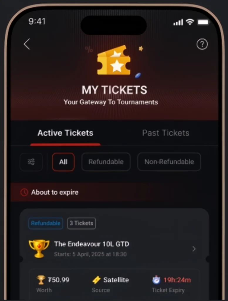 Verfolgen, nutzen oder erstatten Sie Ihre Turniertickets – alles an einem Ort. Ob durch Einzahlungen, Missionen, Satelliten oder Werbeaktionen verdient – Ihre Tickets enthalten alle Details und zeitnahe Erinnerungen.