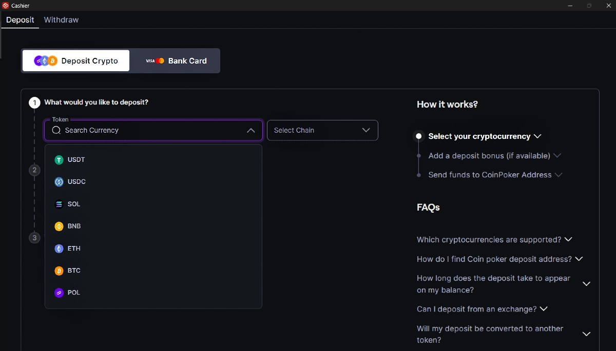 Le dépôt avec CoinPoker est un processus simple, et vous pouvez utiliser une variété de cryptomonnaies. Vous pouvez alimenter votre compte via un wallet personnel ou effectuer un dépôt directement depuis une plateforme d’échange. Nous acceptons le Bitcoin, l’Ethereum, le BNB, le Solana et l’Tether (USDT), parmi plusieurs autres options.