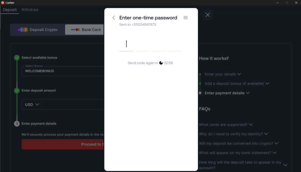 Go to the cashier by clicking on the wallet icon and selecting the option to Deposit. Next, select Bank Card beside Crypto.