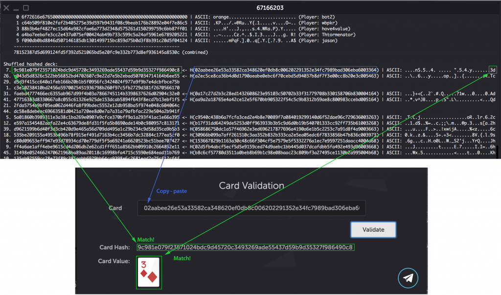 If the result matches the initial deck hash order, then the player has successfully proven that they participated in shuffling the final deck.