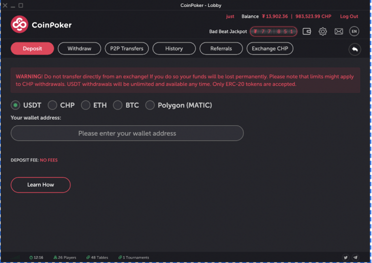 Currently deposits and withdrawals from CoinPoker can be done using CHP, USDT, BTC, ETH, Polygon MATIC. When it comes to deposits, CoinPoker aims to provide real-time global conversion rate and applies no fees, but slight discrepancies are possible.