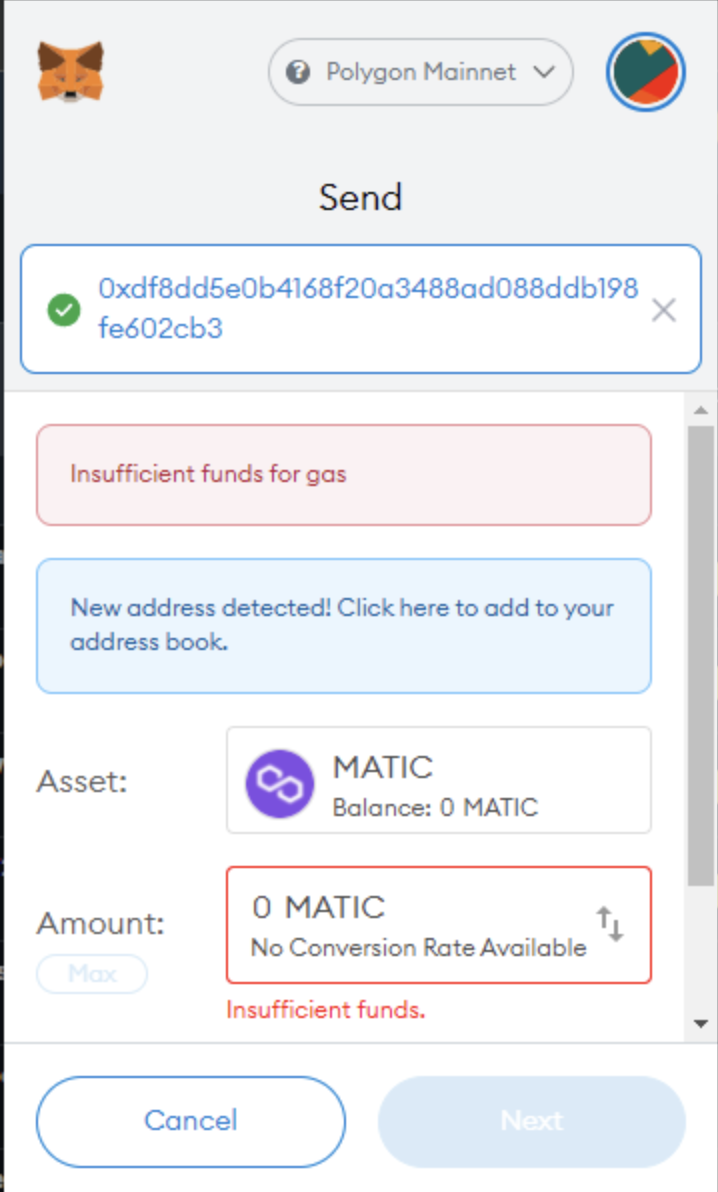 6. Please keep in mind that the Polygon network requires its native token MATIC which will be used to pay transaction fees.