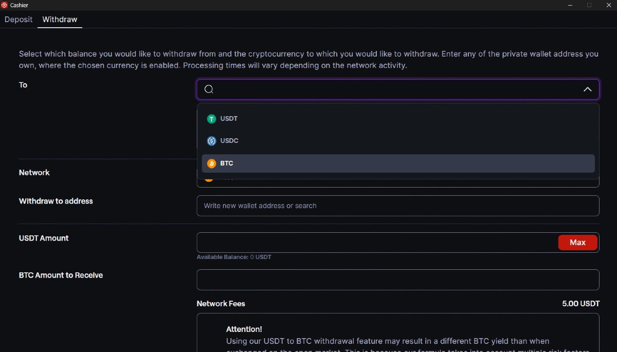 - 入金に利用できる通貨は以下の通りです:BTC、ETH、SOL、USDT、USDC、POL、BNBです。他の暗号通貨での入金は、自動的にUSDTに変換される場合があります。入金を行うことで、入金された通貨が回収され、同等の価値に相当するUSDTと交換されることに同意したものとみなされます。入金の回収と交換は自動化されており、シームレスに行われます。
