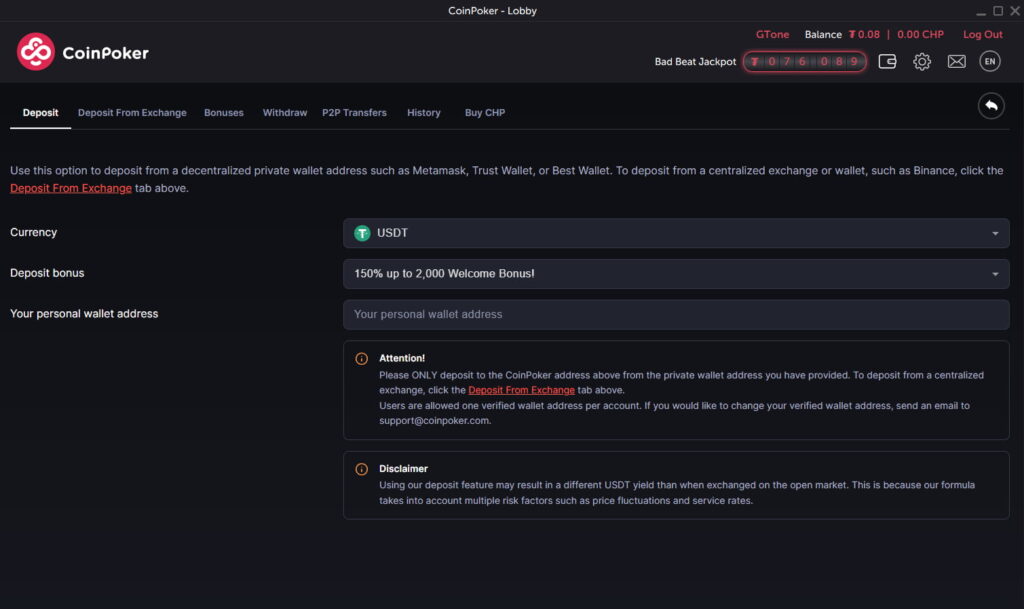 - 암호화폐로 입금: 입금 메뉴에서 BTC, ETH, USDT 또는 CHP 토큰 중 하나를 선택해 입금하세요.