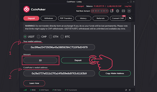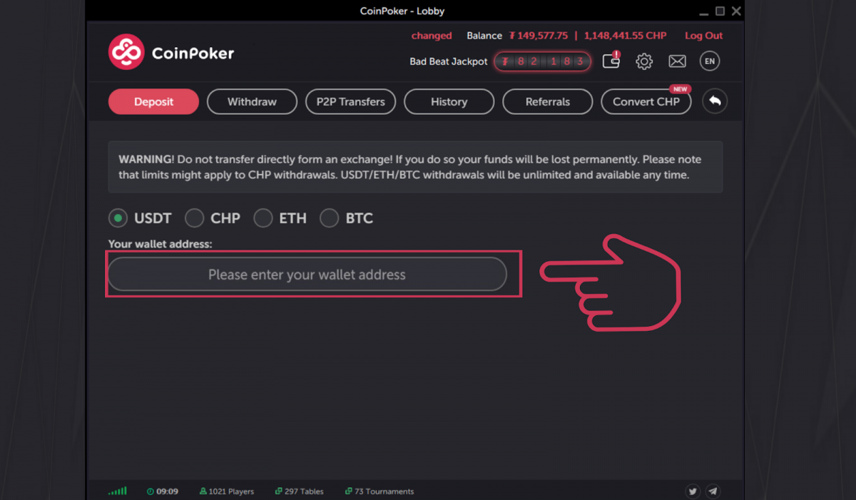 이 단계를 완료했으면 개인 지갑으로 이동하여 자금을 송금합니다. USDT, ETH 또는 CHP를 사용해 입금하면 코인포커 잔액이 대부분 곧바로 업데이트됩니다. BTC 입금은 블록체인 네트워크 활동에 따라 최대 몇 시간이 걸릴 수 있습니다.