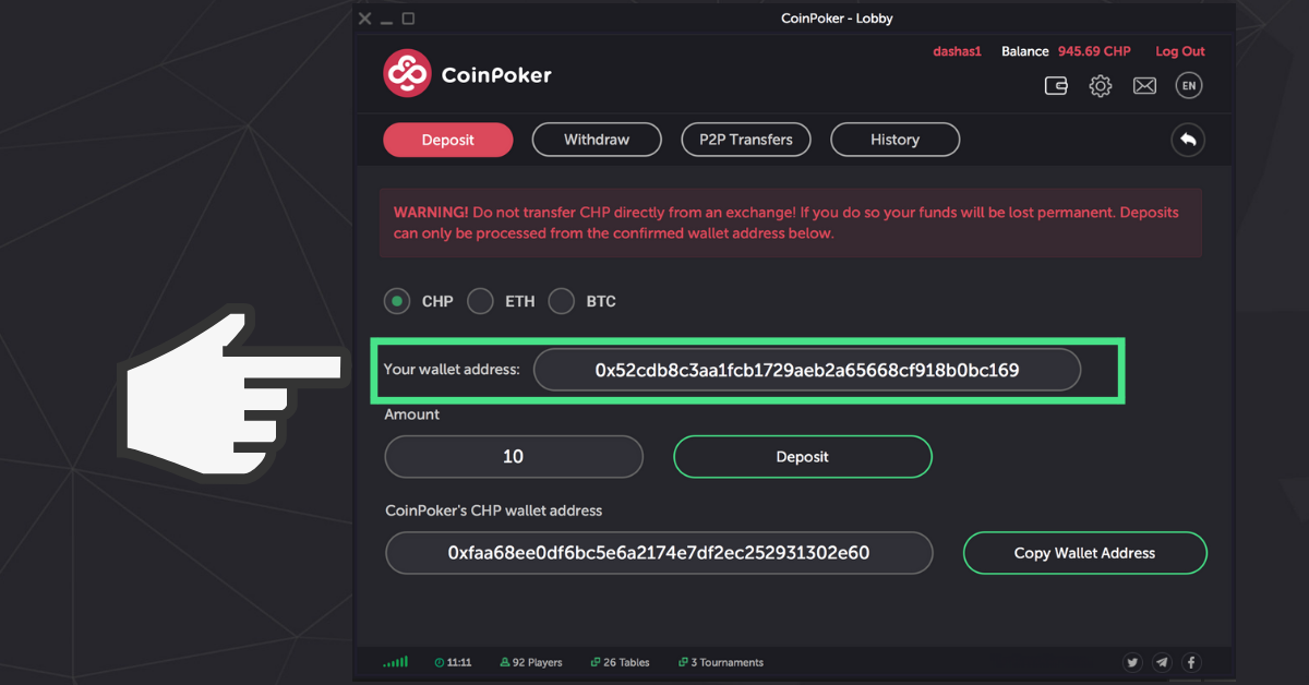 처음으로 ETH 또는 CHP를 입금할 때 사용한 지갑 주소가 확인되면 계정에 연결됩니다. 이렇게 하려면 아래 표시된 필드에 주소를 신중하게 입력하고 계정으로 송금할 ETH 또는 CHP의 금액을 선택해 주세요.