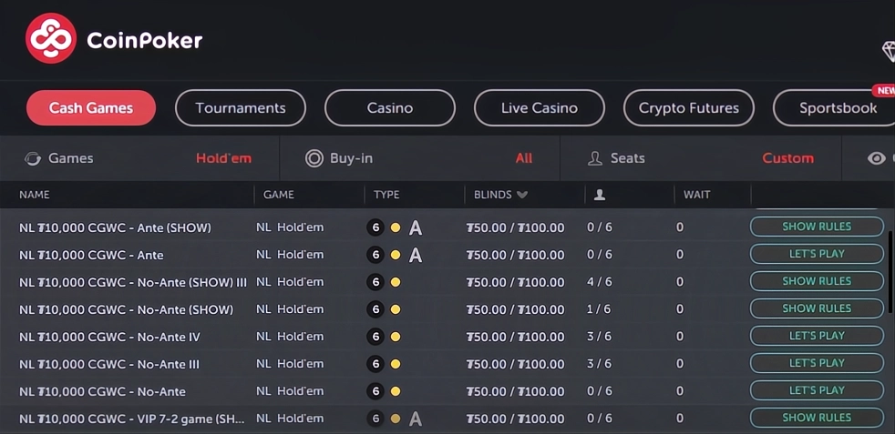 Register on CoinPoker, deposit funds for NL10k play, and locate the High Stakes CGWC tables in the app lobby.