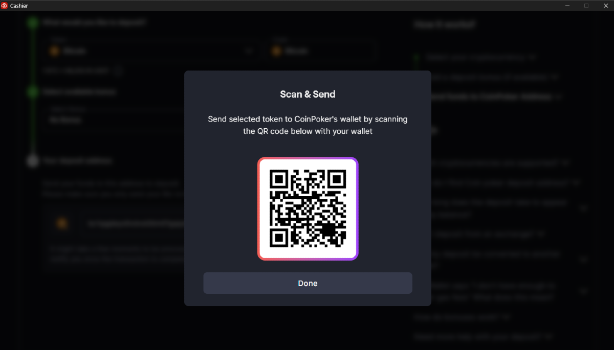 Kişisel kripto cüzdanlarınızdan veya borsalardan CoinPoker hesabınıza doğrudan para yatırabilirsiniz. Süreç basittir, hızlıdır ve CoinPoker kesinlikle hiçbir para yatırma ücreti almaz.
