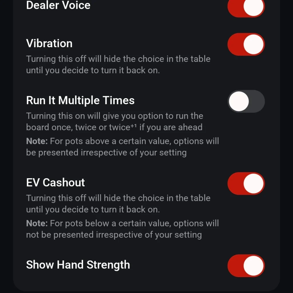 Bật hoặc tắt tính năng Rút tiền EV. Khi tính năng này được kích hoạt, EV Cashout sẽ được cung cấp mỗi khi có một ván all-in hợp lệ xảy ra.