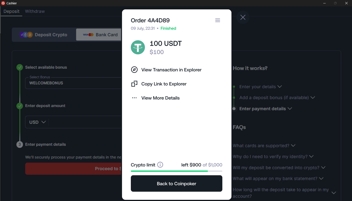 如果您的交易成功,您會看到狀態顯示為「已完成」,並且可以獲得收據。資金將轉換為 USDT,並顯示在您的 CoinPoker 帳戶餘額中。